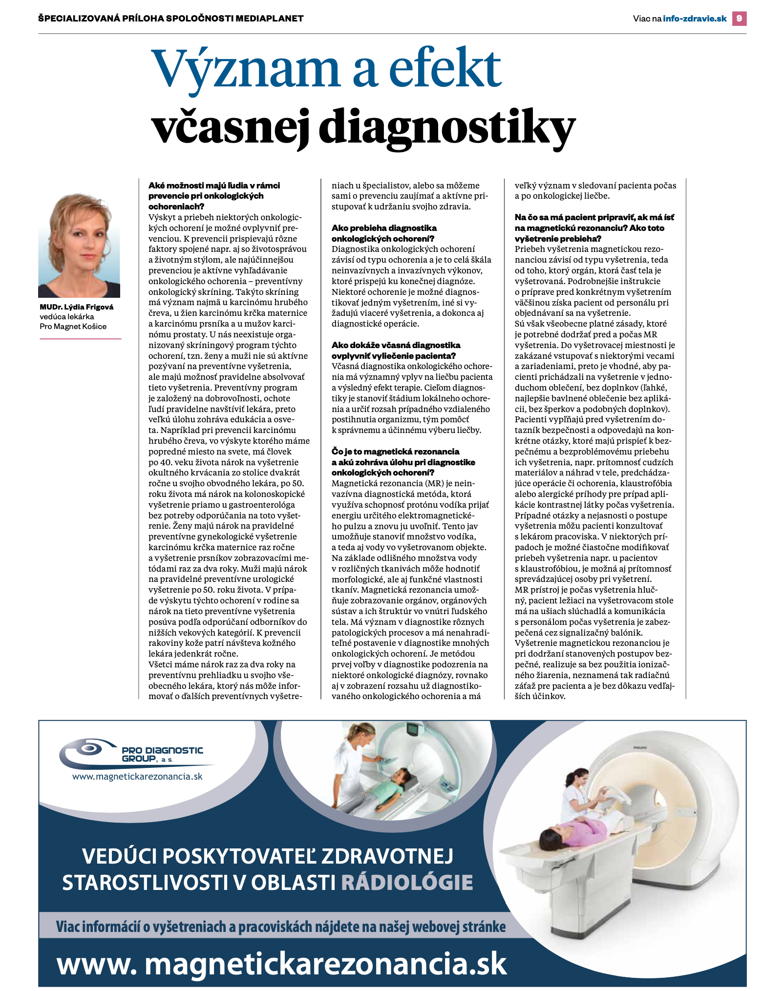 O význame a efekte včasnej diagnostiky, ako aj o samotnom vyšetrení magnetickou rezonanciou sa dozviete viac v rozhovore s vedúcou lekárkou MUDr. Lýdiou Frigovou z pracoviska Pro Magnet v Košiciach: https://www.info-zdravie.sk/onkologia/vyznam-a-efekt-vcasnej-diagnostiky/