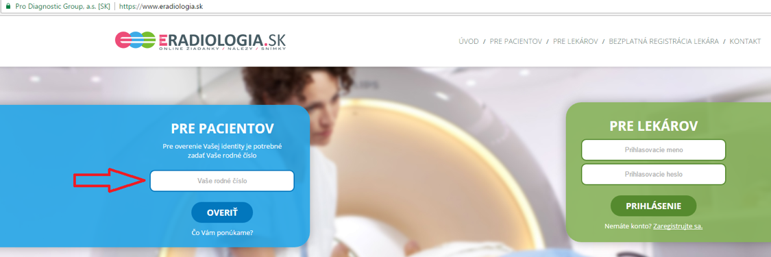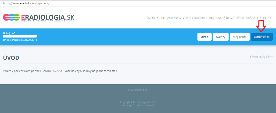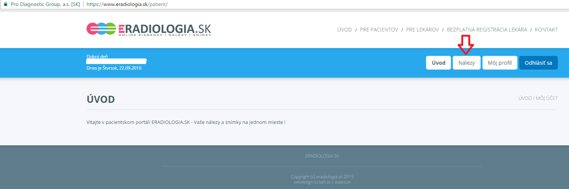 3. Po vstupe do systému sa Vám zobrazí personalizované uvítanie k Vášmu kontu. Môžete začať okamžite pracovať a zo základného menu vybrať sekciu, ktorú potrebujete využiť. V sekcií „Nálezy“ nájdete výsledky z Vášho MR / CT vyšetrenia.