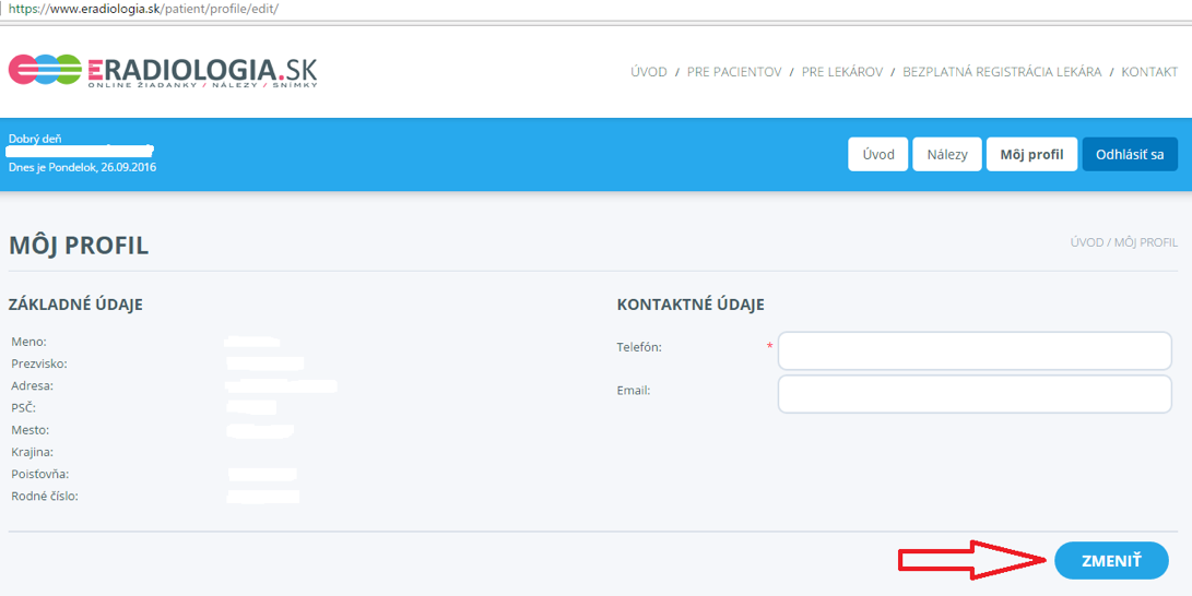 10. V sekcií „Môj profil“ si môžete upraviť Vaše kontaktné údaje. Po zadaní nového telefónneho čísla alebo emailu kliknite na tlačidlo „Zmeniť“.