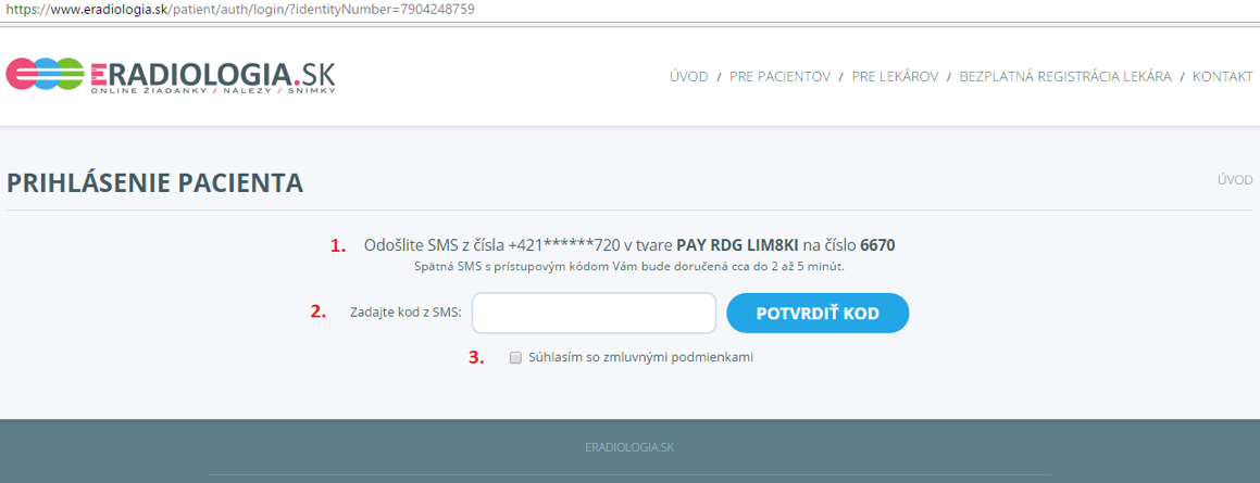 2. Odošlite SMS z Vášho telefónneho čísla v zadanom tvare na číslo 6670. Zadajte doručený kód, zaškrtnite súhlas so zmluvnými podmienkami a potvrďte kód.