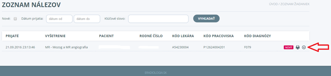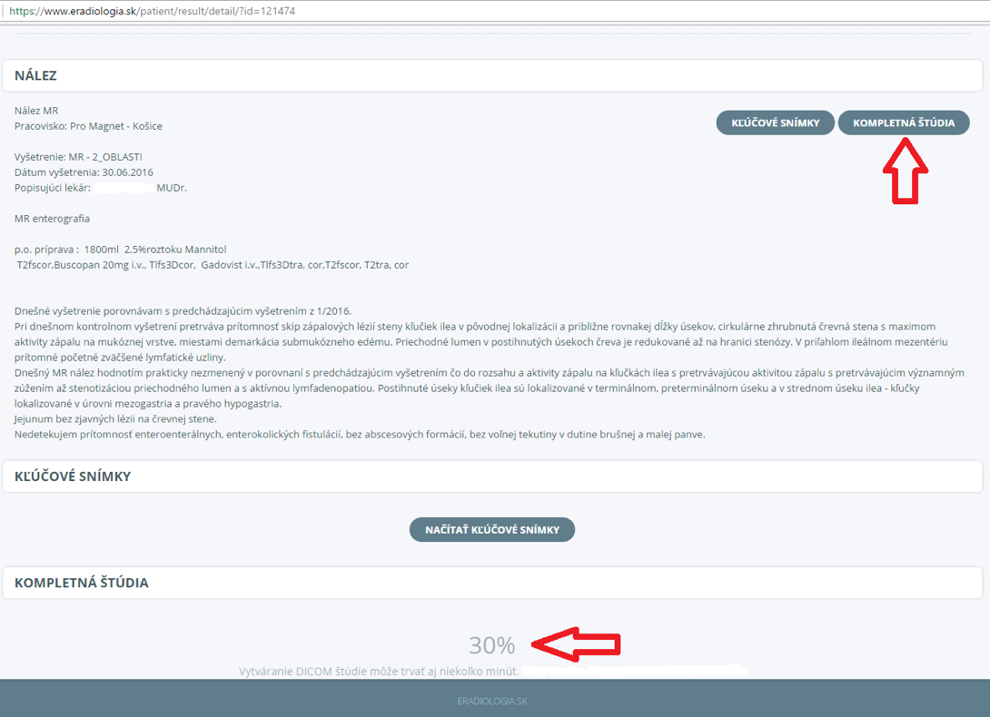 5. Po rozkliknutí detailu nálezu sa Vám zobrazí popis Vášho vyšetrenia. Kliknutím na ikonku „Kompletná štúdia“ sa spustí načítavanie obrazovej dokumentácie, čo môže trvať niekoľko minút.