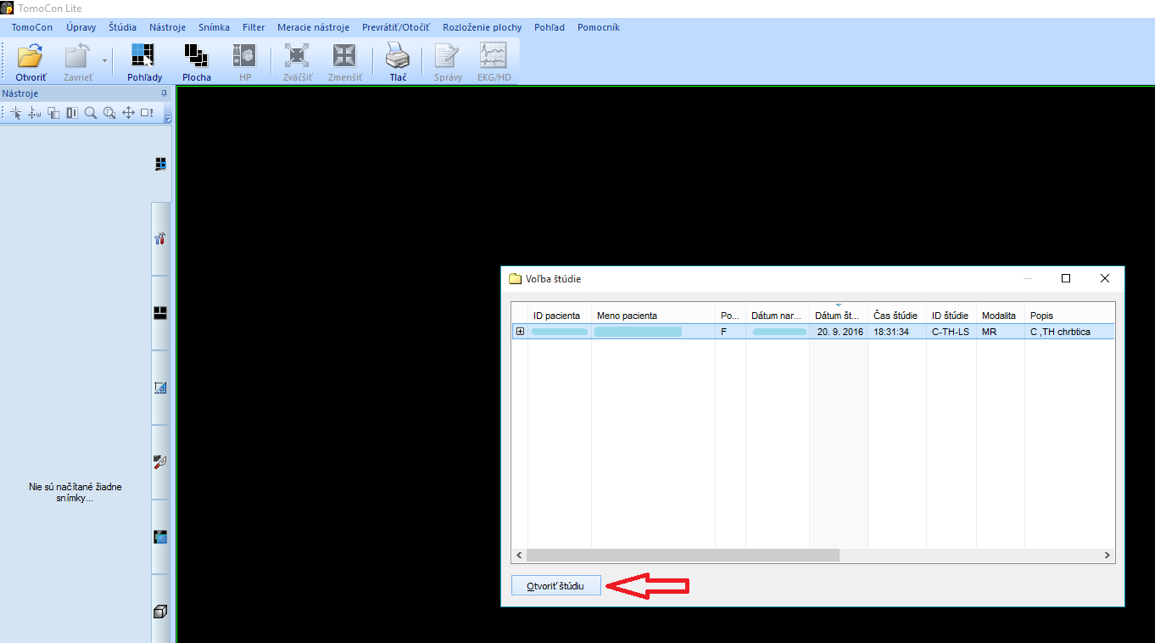 9. Po otvorení aplikácie kliknite na ikonku „Otvoriť štúdiu“. Načíta sa Vám kompletná obrazová dokumentácia z Vášho vyšetrenia.