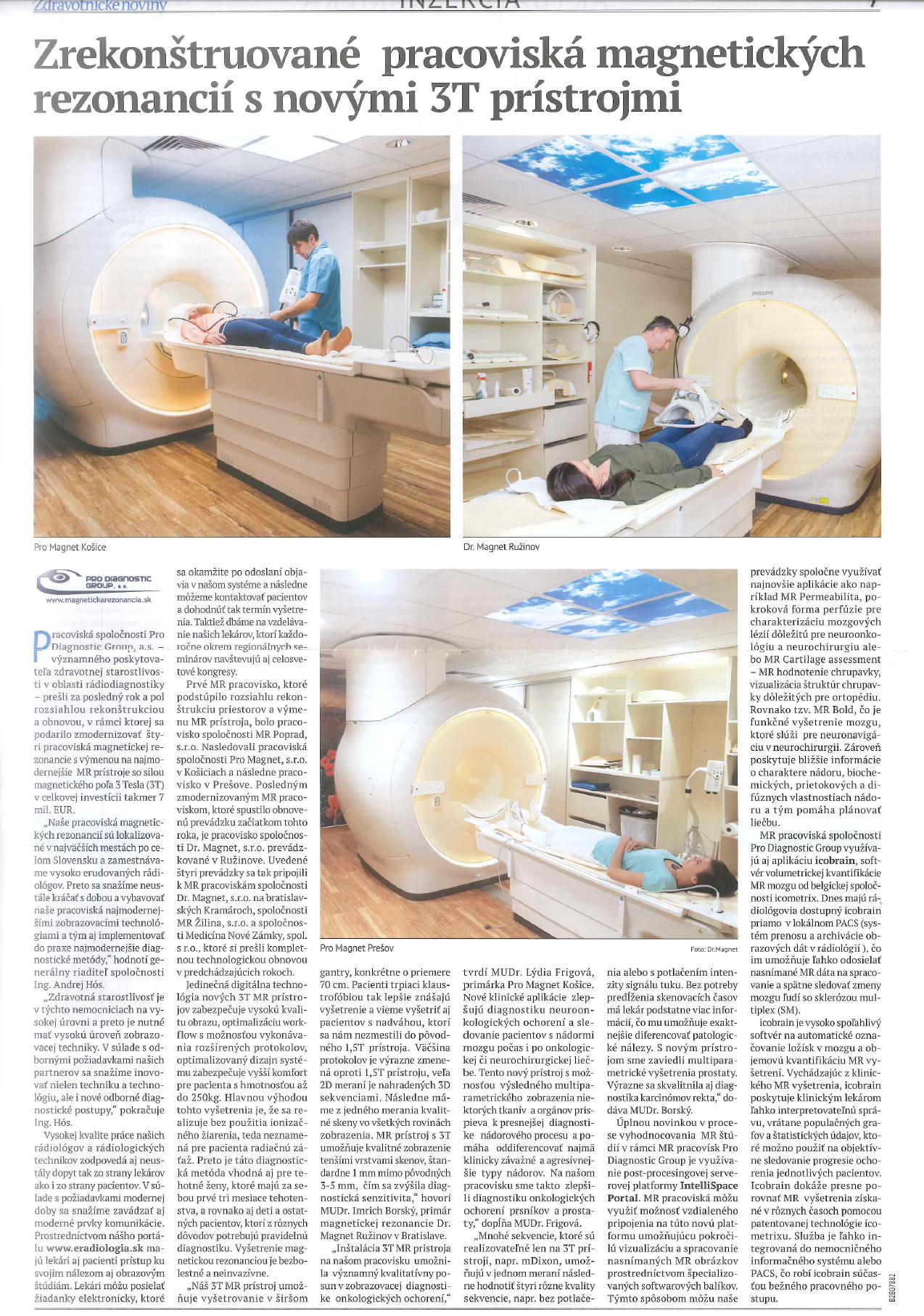 Naše pracoviská magnetických rezonancií sú lokalizované v najväčších mestách po celom Slovensku a zamestnávame vysoko erudovaných rádiológov. Preto sa snažíme neustále kráčať s dobou a vybavovať naše pracoviská najmodernejšími zobrazovacími technológiami a tým aj implementovať do praxe najmodernejšie diagnostické metódy. Naše pracoviská prešli za posledný rok a pol rozsiahlou rekonštrukciou a obnovou, v rámci ktorej sa podarilo zmodernizovať štyri pracoviská magnetickej rezonancie s výmenou na najmodernejšie MR prístroje so silou magnetického poľa 3 Tesla (3T ). Prvé MR pracovisko, ktoré podstúpilo rozsiahlu rekonštrukciu priestorov a výmenu MR prístroja, bolo pracovisko spoločnosti MR Poprad, s.r.o. Nasledovali pracoviská spoločnosti Pro Magnet, s.r.o. v Košiciach a následne pracovisko v Prešove. Posledným zmodernizovaným MR pracoviskom, ktoré spustilo obnovenú prevádzku začiatkom tohto roka, je pracovisko spoločnosti Dr. Magnet, s.r.o. prevádzkované v Ružinove. Uvedené štyri prevádzky sa tak pripojili k MR pracoviskám spoločnosti Dr. Magnet, s.r.o. na bratislavských Kramároch, spoločnosti MR Žilina, s.r.o. a spoločnosti Medicína Nové Zámky, spol. s r.o., ktoré si prešli kompletnou technologickou obnovou v predchádzajúcich rokoch.