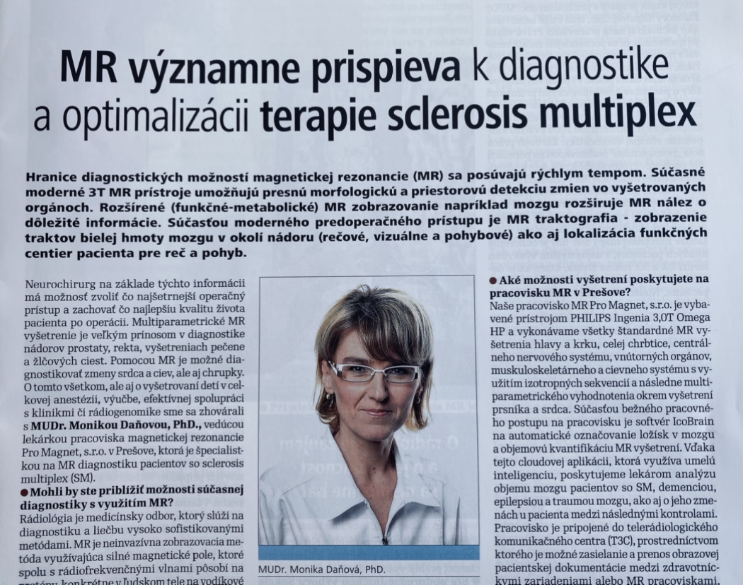 "Doménou MR je diagnostika ochorení mozgu, miechy, chrbtice vrátane zobrazenia chrbticového kanála a platničiek, teda najviac je MR využívaná v oblasti neurorádiológie." V najnovšom vydaní Lekárskych listov/Varia c. 9/2021 si môžete prečítať rozhovor s MUDr. Monikou Daňovou, PhD., vedúcou lekárkou pracoviska magnetickej rezonancie Pro Magnet v Prešove, ktorá je špecialistkou na MR diagnostiku pacientov so sclerosis multiplex: http://bit.ly/Lekarskelisty